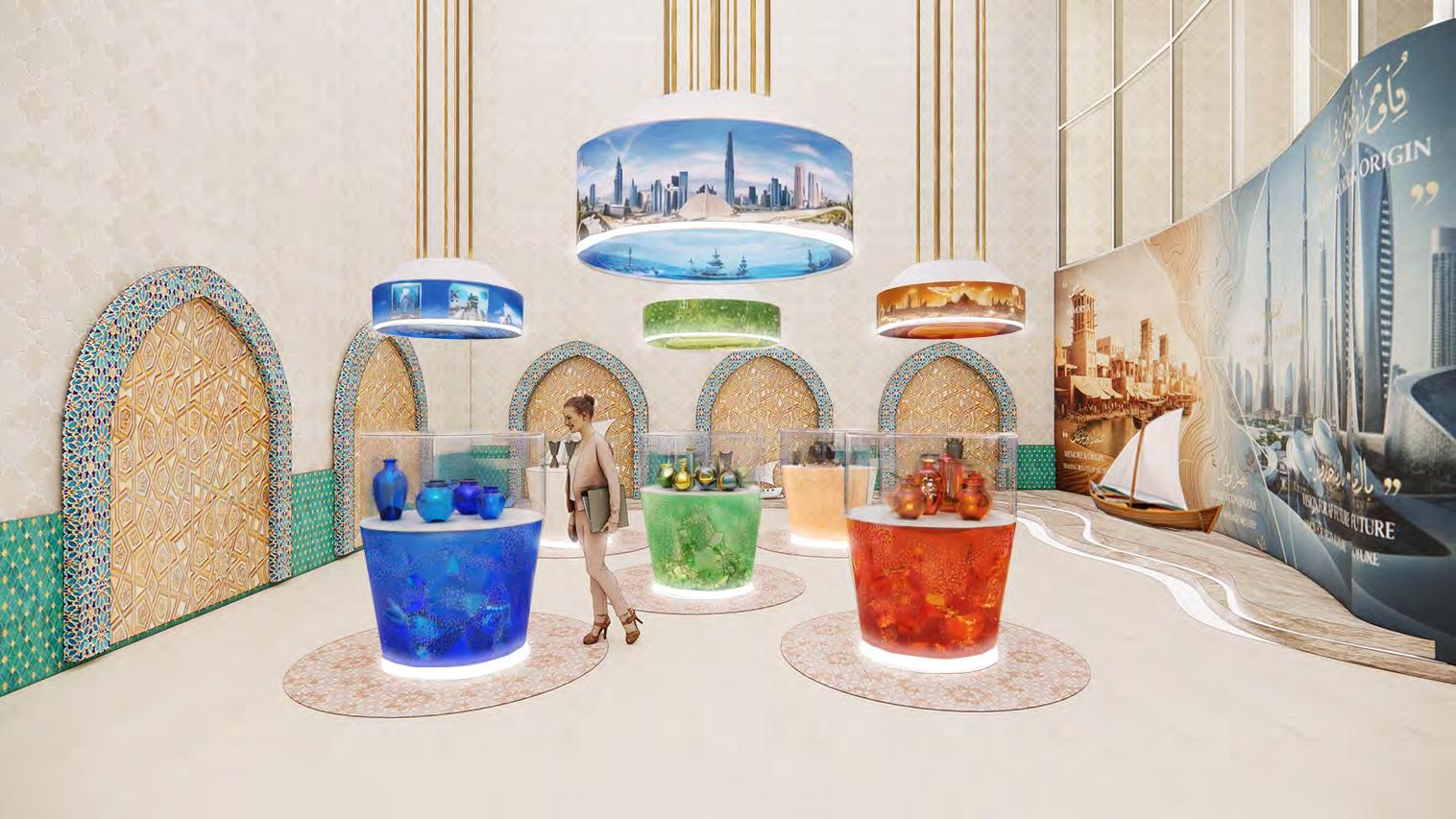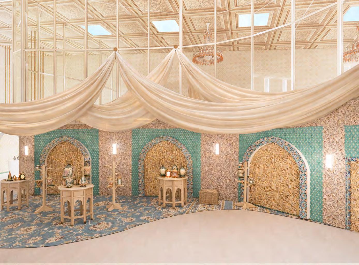 Layered patterns from different Arabic periods form a visual timeline that unfolds throughout the hub