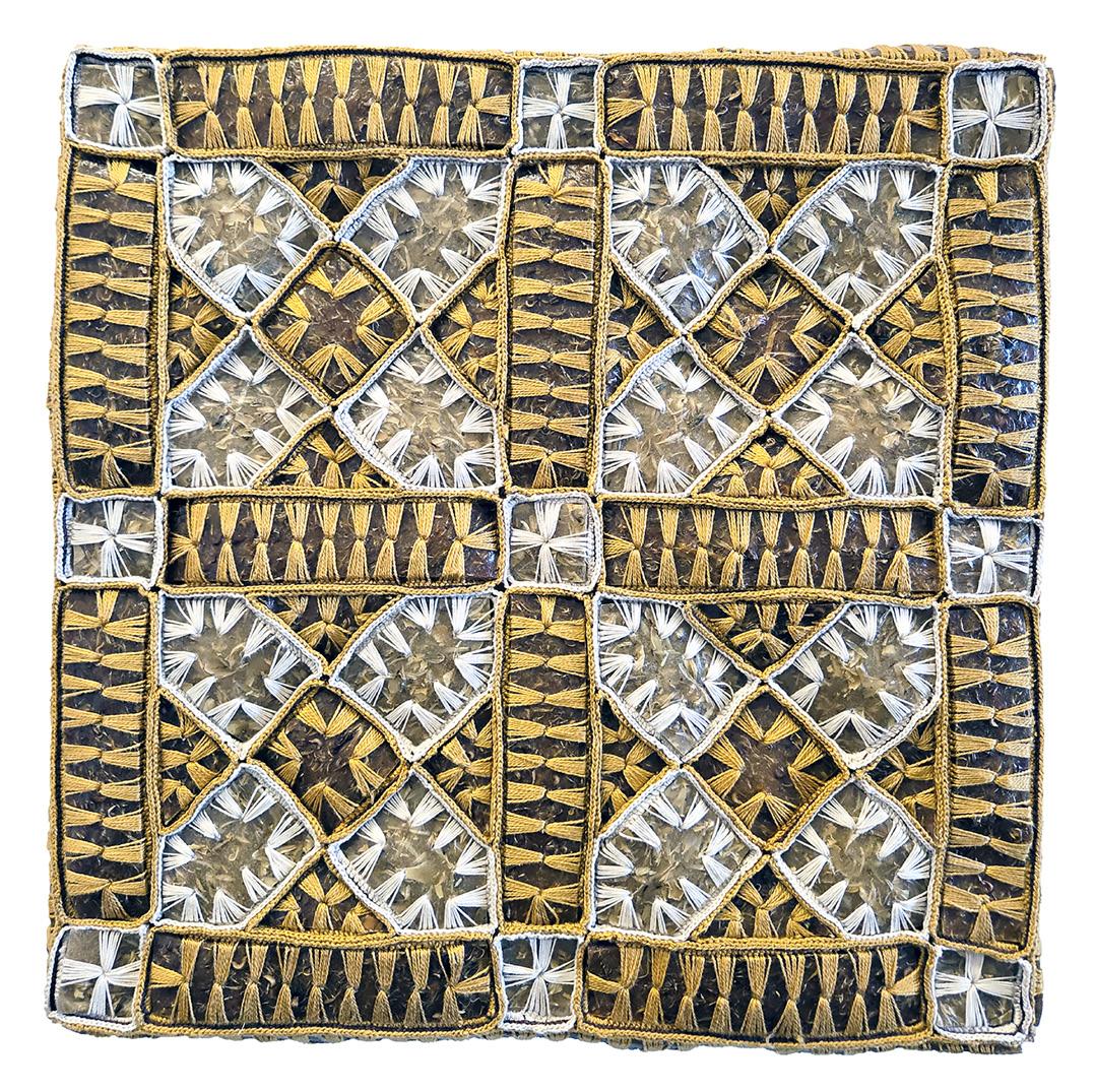4 Janine Brown, Bittersweet Thoughts, 2025, home-cooked bioplastic, calendula petals, white zinnia petals, hand-stitched with crochet thread and pearl cotton, wood panel, 15 x 15 x 1.5 inches.