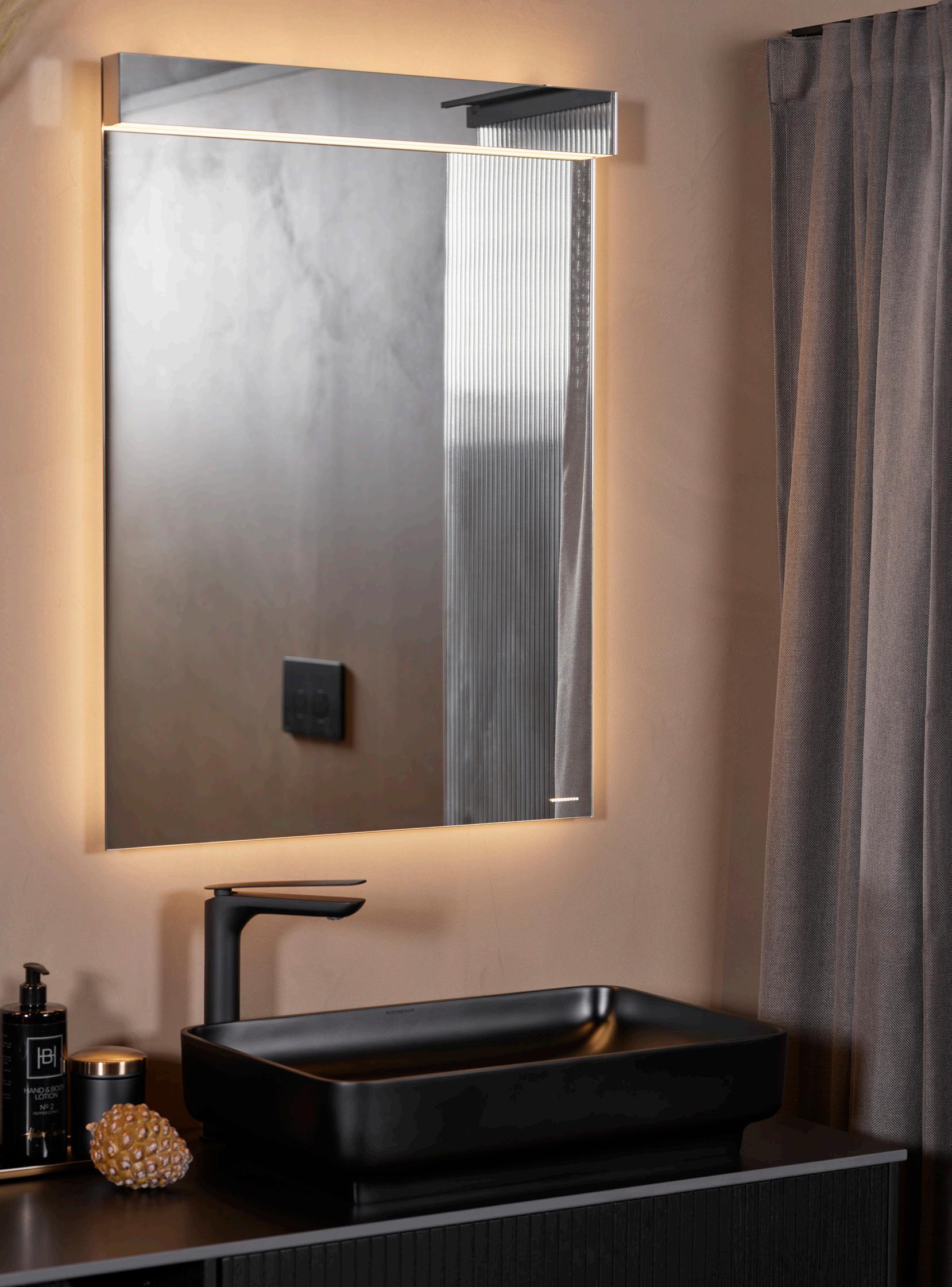 En valgfri gulvlampe skaber en eksklusiv og hyggelig stemning på badeværelset. Belysningen er placeret på undersiden af badeværelsesmøblet. Tilføj et driverkit (valgfrit).