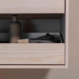 Stilfuldt og funktionelt skuffeinteriør indgår. Bunden af skuffen er lavet af metalplade, et praktisk materiale, der er nemt at holde rent. Skillevæggene er udført i massivt træ, malet i samme farve som fronten.