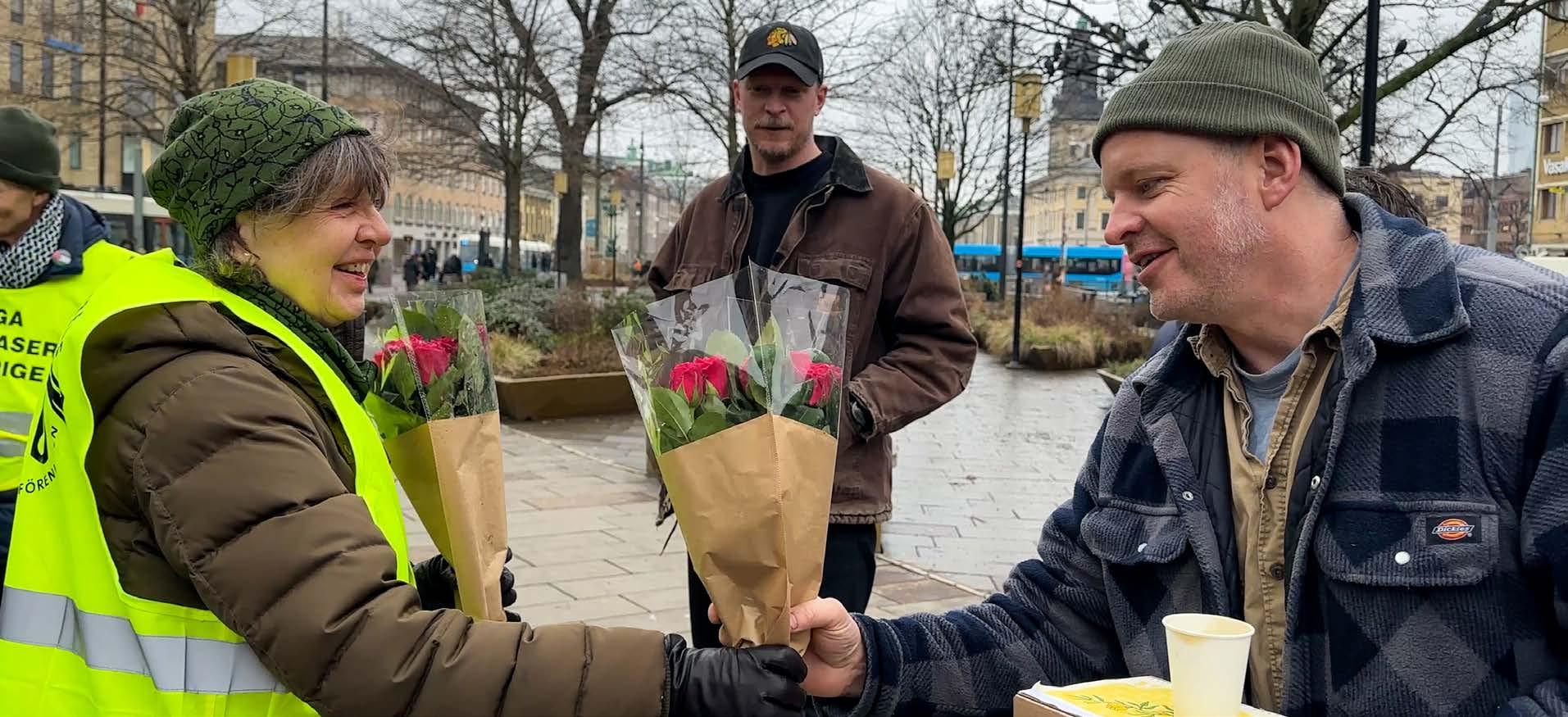 Maria Löfgren från Svenska Freds lokalförening i Göteborg lämnar över ros till Johan Eliasson och i bakgrunden Johan Nyberg. Fotograf: Martin Smedjeback
