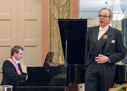 Måltiden inleddes traditionsenligt med Kungssången varefter Staffan Alveteg (sång) och Kevin Lembke (piano) bjöd på ett väl sammansatt program bestående av ”Prins Gremins aria” från ”Eugene Onegin” av Pjotr Tjajkovskij, sången ”Livets njutning” av Frans Michael Franzén och Olof Åström samt ”Arabesque nr 1” av Claude Debussy.