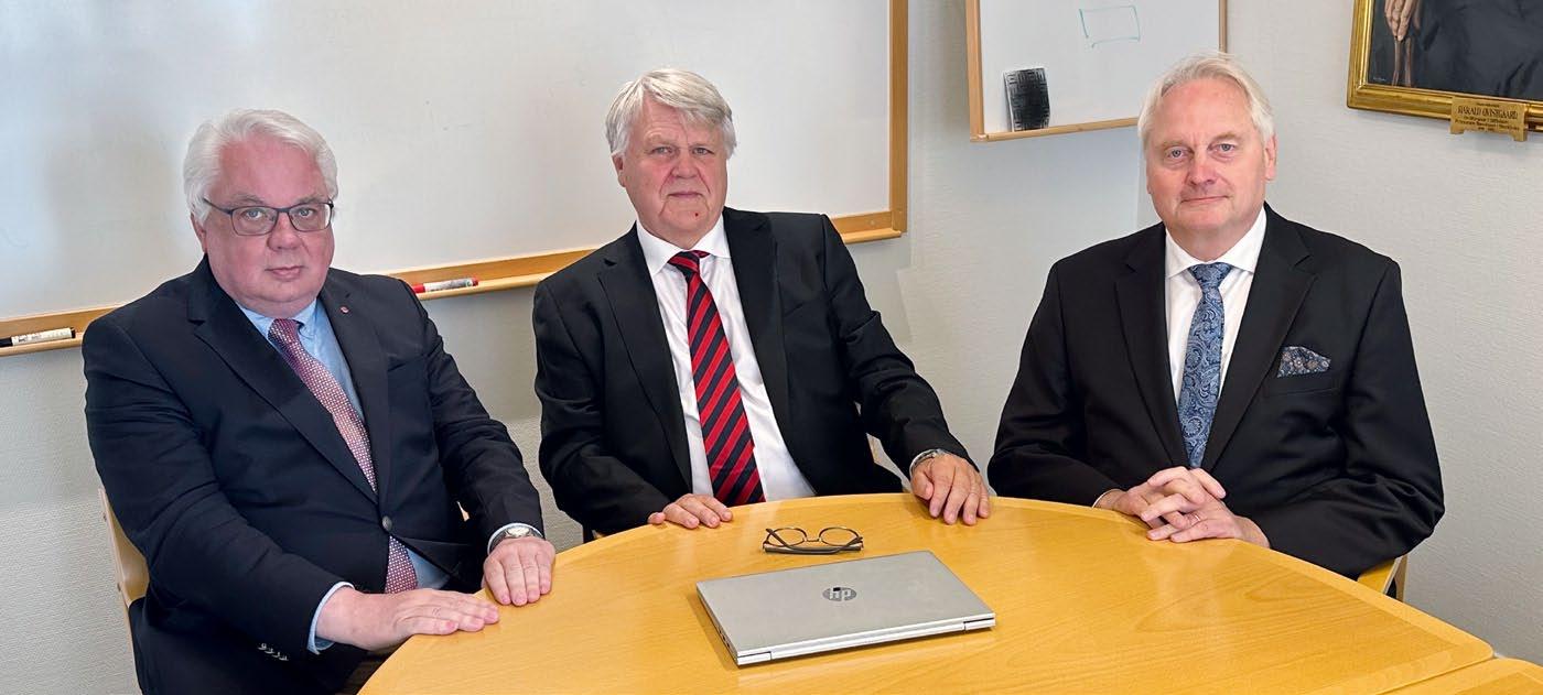 Från vänster: S:t Johanneslogen S:t Nicolaus ordförande mästare Thomas Persson, provinsialmästare Per Arosenius och Stormästare Christer Persson vid den kubiska stenen i Frimurarhusets trädgård.