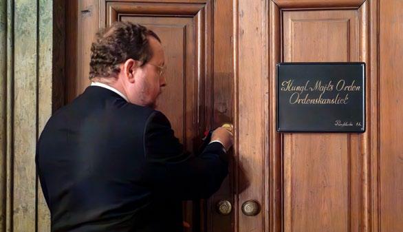 ianslutning till de imposanta Ordenssalarna på Stockholms slott huserar Kungl. maj:ts Orden, KmO. en vacker, handmålad skylt leder in till de utrymmen, där de svenska riddarordnarna administreras av ett litet antal sakkunniga.