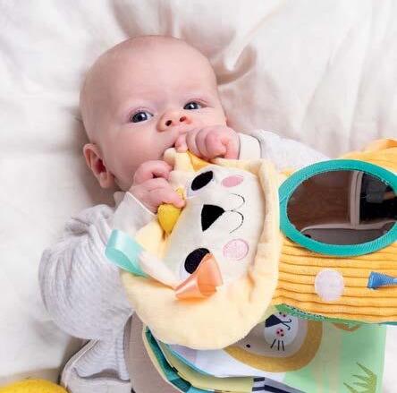 Farm Buddies barnvagnsleksak är en färgglad tygkompis i ekologisk bomull med majsfiberfyllning och är helt fri från polyester. Materialen är naturligt hypoallergena och säkra för nyfödda och barn med allergier och känslig hud. Finns även som blå hund och rosa mus. www.amvina.se