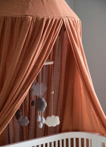 Sänghimmel i färgen sweet tea brown från danska Sebra. Läcker bomullskvalitet med muslintextur. Kan både användas över sängen och för att skapa en myshörna i rummet. Mobil i filt, varmgrå. www.sebra.dk