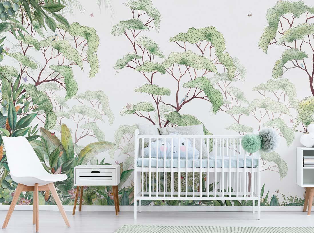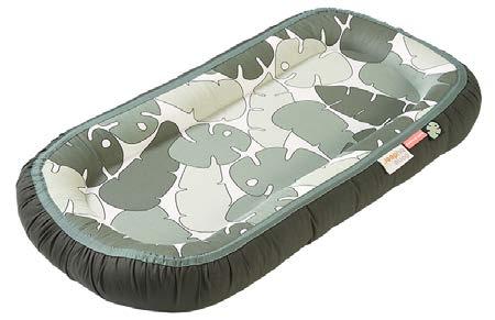 Baby nest prydd med stora gröna löv omsluter den lilla och skapar en trygg plats att sova på. Dra i snörena för att reglera storleken allt eftersom barnet växer. Placeras på plant underlag och bär inte barnet i baby nestet.