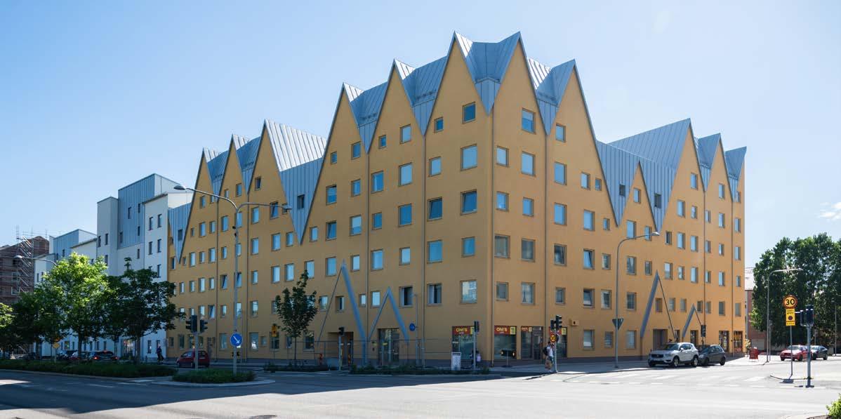 FOKUS I BYGGET är hållbarhet. Fa saden blir underhållsfri i behandlat trä, bergvärme och ventilation ska integreras och samspela för att mini mera energiförluster. Det kommer också att byggas utekorridorer och loftgångar för att minimera ener gianvändningen och balkongernas kragar mot söder ska minimera sol