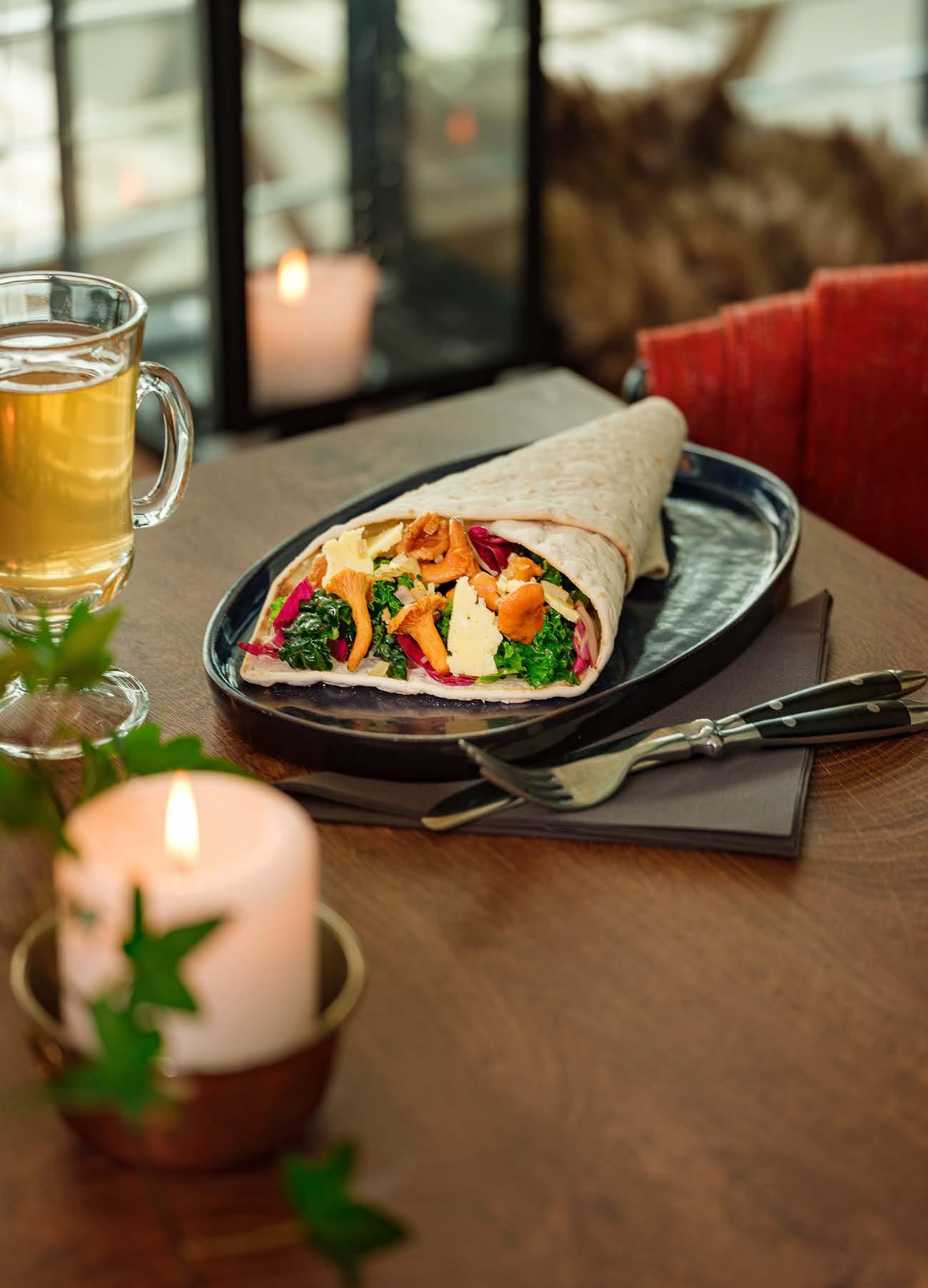 Art.nr: 247 Korvtunnbröd – Brödet är ett smart och mångsidigt tunnbröd som är älskat av många. Halvmåneformatet passar utmärkt för att göra en matig rulle att servera till höstens serveringar. Här har vi en varm tunnbrödsrulle med smörstekta gula kantareller, höstsallad, lök, örter och hyvlad Västerbottensost.