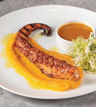 Mushroom (Charred Leek Remoulade, Black Garlic, Yuzu Vinaigrette GF) - $21, Local Stracciatella (Florida Tomatoes, Baby Arugula, Basil, Grilled Focaccia) - $21, Charred Eggplant (Yuzu Sesame-Miso Tahini, Fresh Herb Salsa Verde) - $17, Grilled Octopus (Butternut Squash Puree, Aji-Amarillo-Miso Dipping Sauce) - $29.