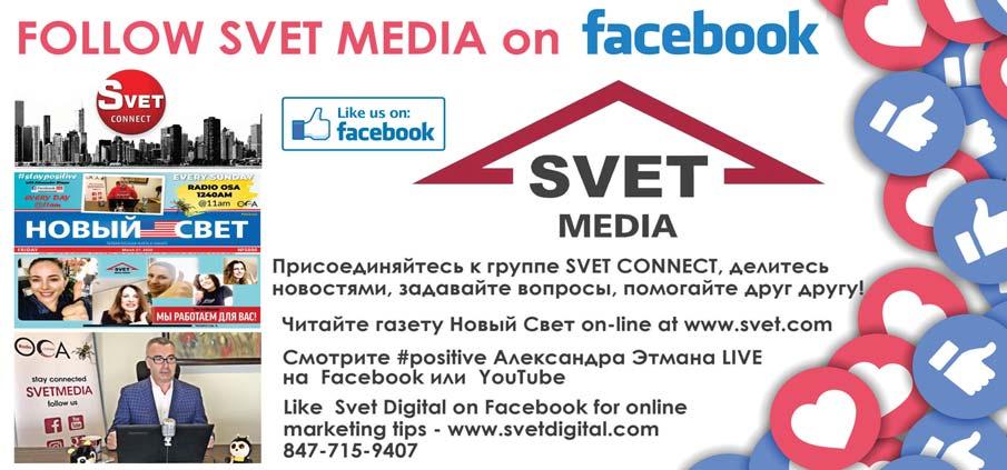 друг от друга. Хоть раз попробуй сказать Змею «нет»... - Это ты скажи «змею»«нет», - сказала жена. - Вон вчера после встречи с тобой унесли Тодора Живкова. - Не Тодора Живкова, а Здравко Тодорова, - сказал я. - И не я вызывал его на соревнования... Короче, вечером мы поехали на фламенко в небольшое кафе на горе в Марбелье - в конце тяжелого по отпускным меркам дня: после двухчасового тенниса, 8-километровой пробежки по пляжу, до обидного поэтому ВЫХОДИТ С 14 ЯНВАРЯ 1992 ГОДА · PH.: 847.715.9407 · WWW.SVET.COM · E-MAIL: ADS@SVET.COM · ISSN 10671870, USPS 009377 FRIDAY №6019 June 7, 2024 (Продолжение на стр. 3) ПЕРВАЯ ГАЗЕТА ЧИКАГО НА РУССКОМ ЯЗЫКЕ Александр Этман Сергей Сосновский EVERY SUNDAY AT 11:00AM RADIO OSA 1240AM Горячая линия “ Нового Света ” е с т ь в о п р о с ? У н а с е с т ь о т в е т ! есть вопрос нас есть ответ 847-477-7770 щ е т е а д в о к а т а , в р а ч а , ш к о л у , т н ы й з а л ? М ы п о с о в е т у е м л у ч ш и х а л и с т о в и л и ч н о п р о с л е д и м , ч т о б ы в ы о с т а л и с ь д о в о л ь н ы . Ищете адвоката врача школу банкетный зал Мы посоветуем лучших специалистов лично проследим чтобы вы остались довольны Г о р я ч а я л и н в а с И б а н к е с п е ц и #1 Medicare Insurance Platinum Broker Comparing Medicare plans for 2024? I am here to help! POLINA SEGAL Licensed Sales Agent Insurance On Demand , Inc. 847-452-8193 p.segal@comcast.net dental insurance plans for under 65 & plans We also offer private individual health & on Healthcare.gov to get you help from the government to pay for your insurance. Из дальних странствий ÑÊÀÇ ÏÐÎ ÌÀÐÐÀÍÎÂ