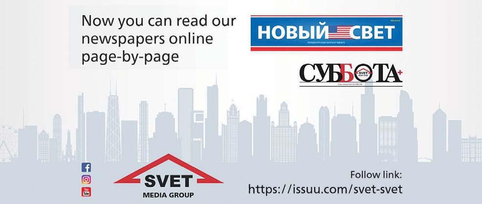 УСЛУГИ Все виды электрических работ Тел. 847-847-6687. ВСЕ ВИДЫ САНТЕХНИЧЕСКИХ РАБОТ ДОСТУПНЫЕ ЦЕНЫ ЗВОНИТЬ 847-571-5215 Александр PL#058-196476. 2013 Hyundai Sonata automatic selling price....................................... $1900 Black 2015 Chevrolet Trax automatic selling price.......................................... $1900 White 2014 Chevrolet Malibu automatic selling price..................................... $1900 White 2011 Mazda 3 automatic selling price..................................................... $1900 Gray 2010 Honda Odyssey 7pass automatic selling price............................... $1900 Blue 2013 Ford F-150 Pick up automatic selling price............................... $1900 White 2017 Chevrolet Cruze automatic selling price........................................... $2500 Red 2014 Ford Econoline Cargo automatic selling price............................... $2500 Blue 2017 Nissan Sentra automatic selling price............................................ $2600 Grey 2015 Kia Forte automatic selling price................................................... $1900 Silver 13 Chevrolet Equinox automatic selling price.......................................... $1900 Blue Редакция не несет ответственности за содержание реклам. Все права на графический дизайн реклам принадлежат SVET International Pablishing Co. Рукописи не рецензируются и не возвращаются. Точка зрения авторов публикуемых материалов может не совпадать с мнением редакции. В номере использованы материалы журналистов «НС», информационных агентств, медиакомпаний Ramfort, Ltd и SIP Co. Наш телефон: (847) 715-9407 Для размещения объявлений в рубрике Classified звоните по телефону: (847) 715-9407 www.svet.com e-mail: ads@svet.com Главный редактор Александр ЭТМАН alex@svet.com