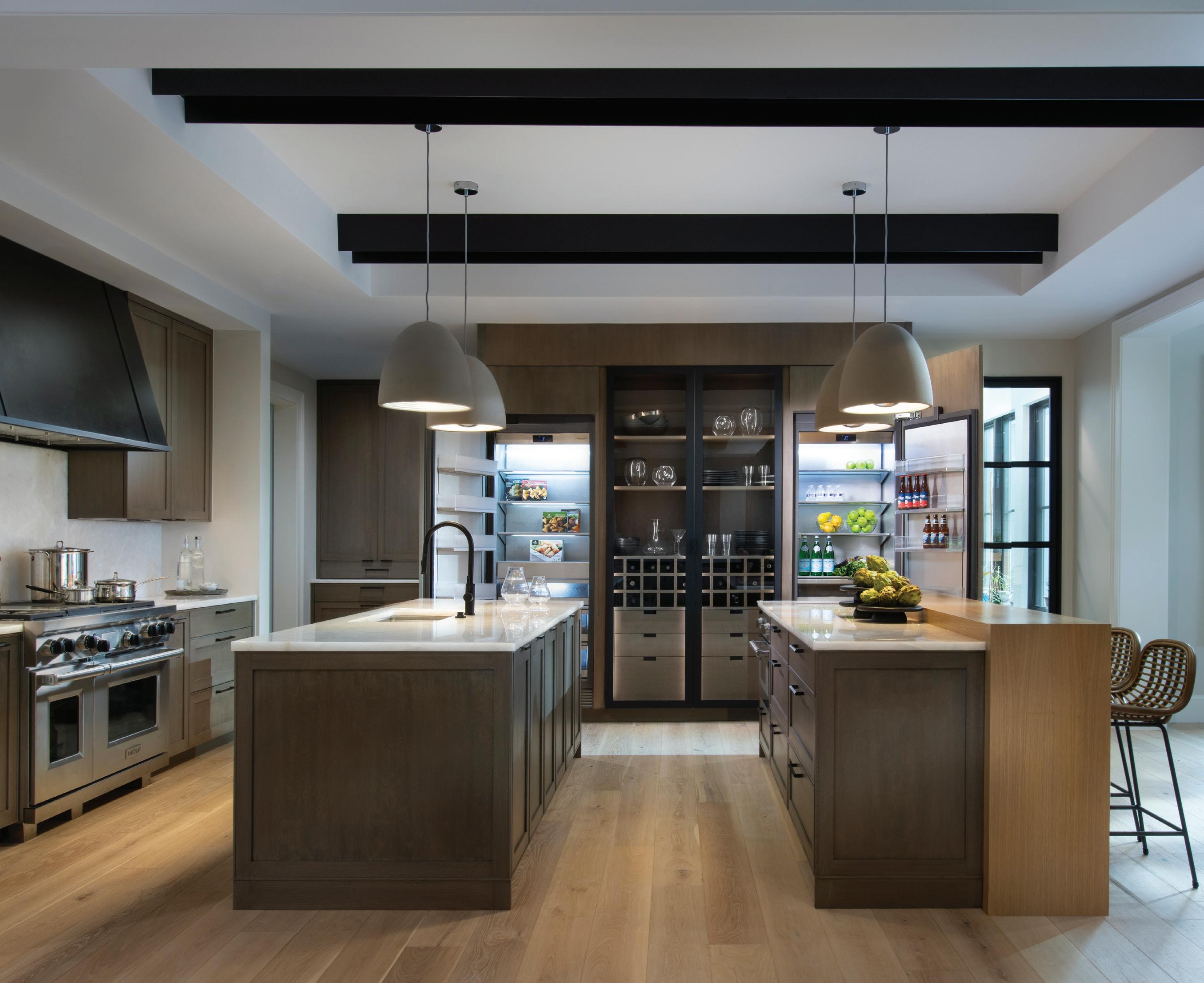cabinetry and interior design work. From altering the kitchen from a single island with the range centered off of the fireplace to a layout featuring two large islands, builtin refrigerator and freezer columns, and a glass-enclosed wine display, to integrating low voltage lighting in the primary closets, and using large paver tiles carried throughout the primary suite bathroom and closets, Mooney noted Chris Jacob helped them with the design direction, furniture, cabinetry selection and design, the color schemes,