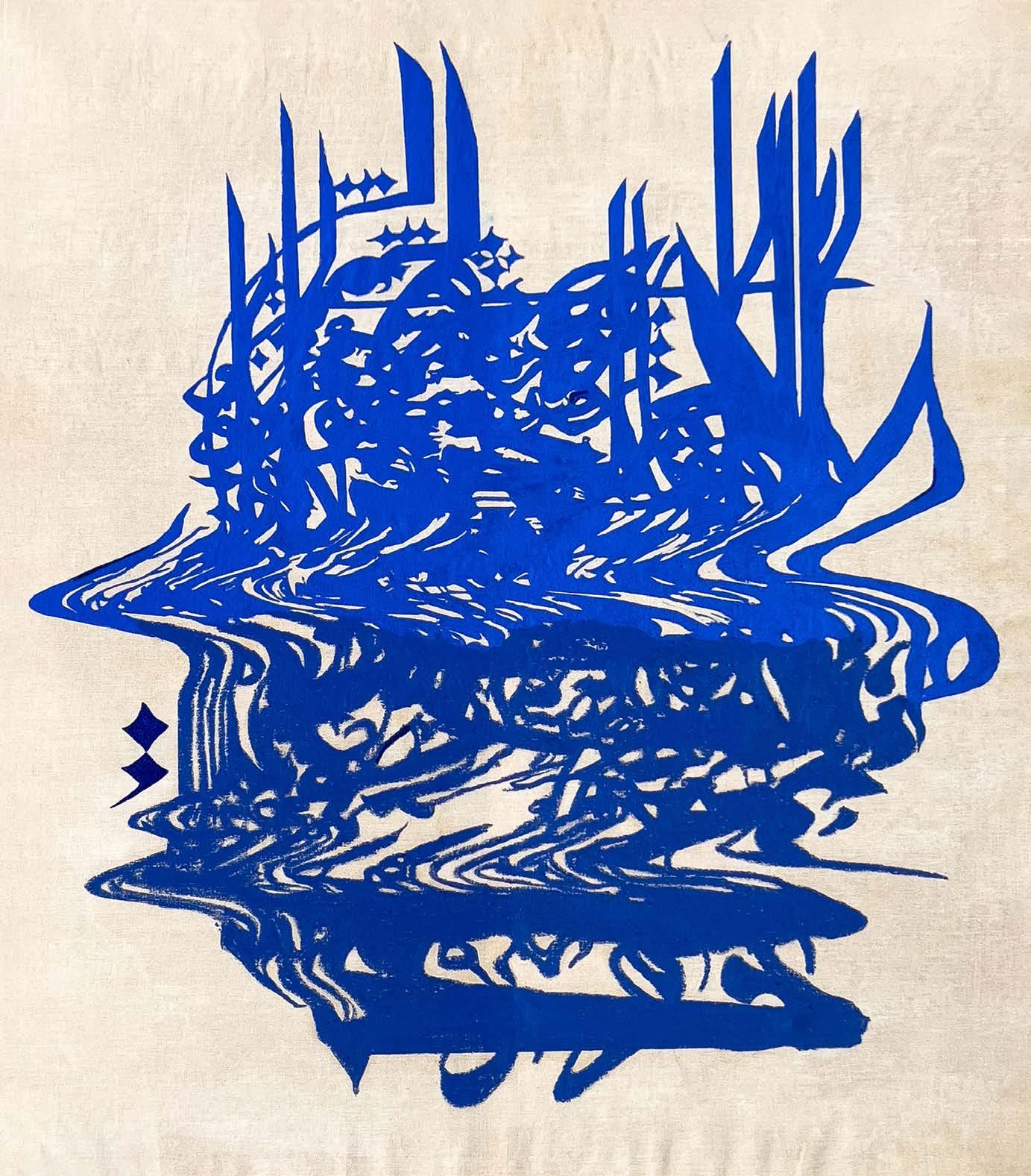 Dallas-based Adnan Razvi is a Ugandan Pakistani American multidisciplinary artist exploring themes related to memory, history, ecology, water, migration, societal connection, identity, and joy. Memory of a Future Once Imagined includes large-scale works from Razvi’s ongoing series, MAWIMBI To make the works, Razvi travels globally, visiting bodies of water to create multi-dimensional paintings on linen. His process involves direct interaction with the waterways and natural environments, where he layers and builds the artwork by using elements like sediment from the water and earth. The resulting works are abstract, textured representations of bodies of water on the canvas, metaphors for the movement of peoples throughout the world. Additionally, Razvi’s collaborative video installation with Dallas-based Taylor Cleveland animates the MAWIMBI work, blending elements of futurism, documentation, and movement across time and space.