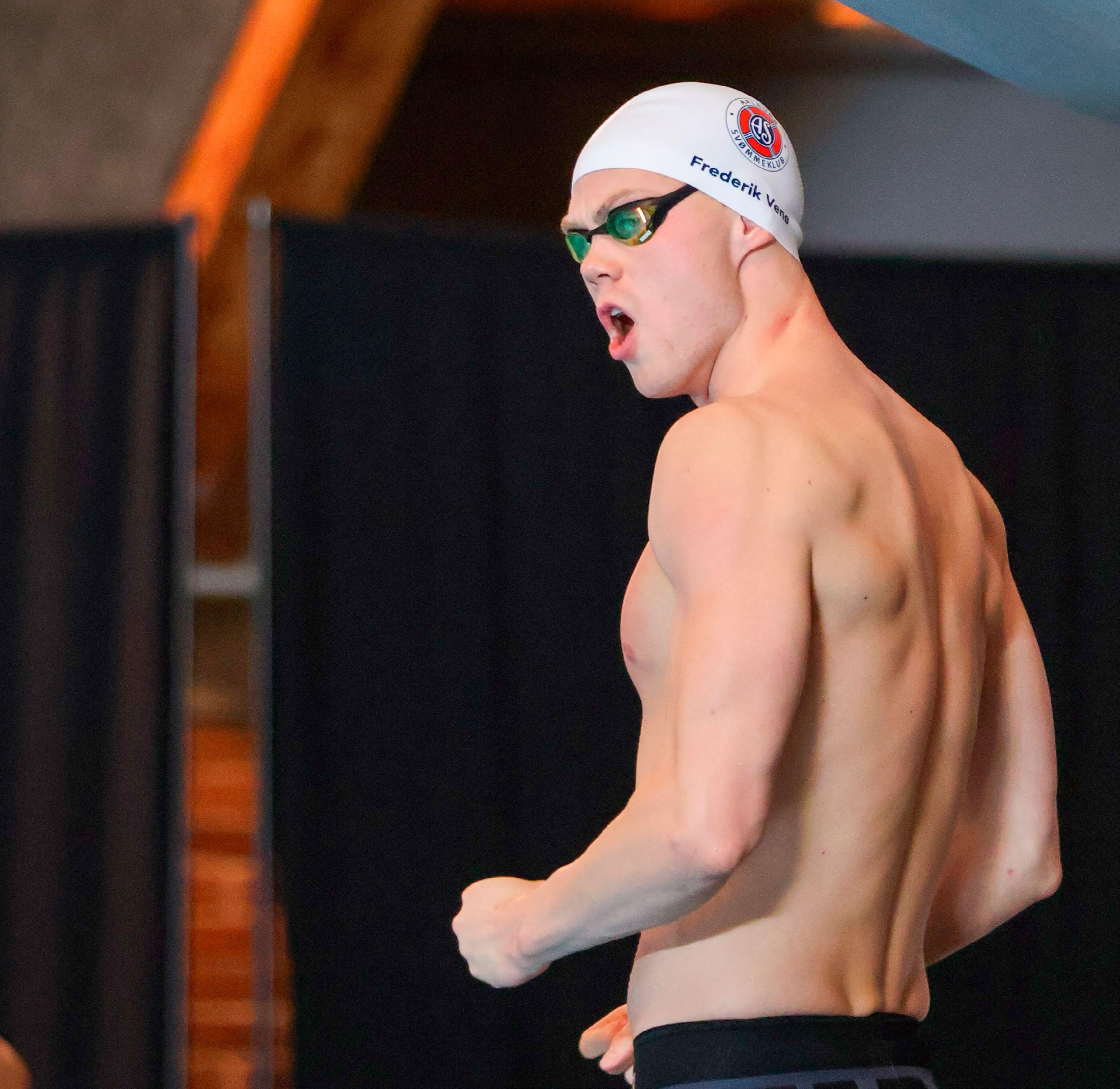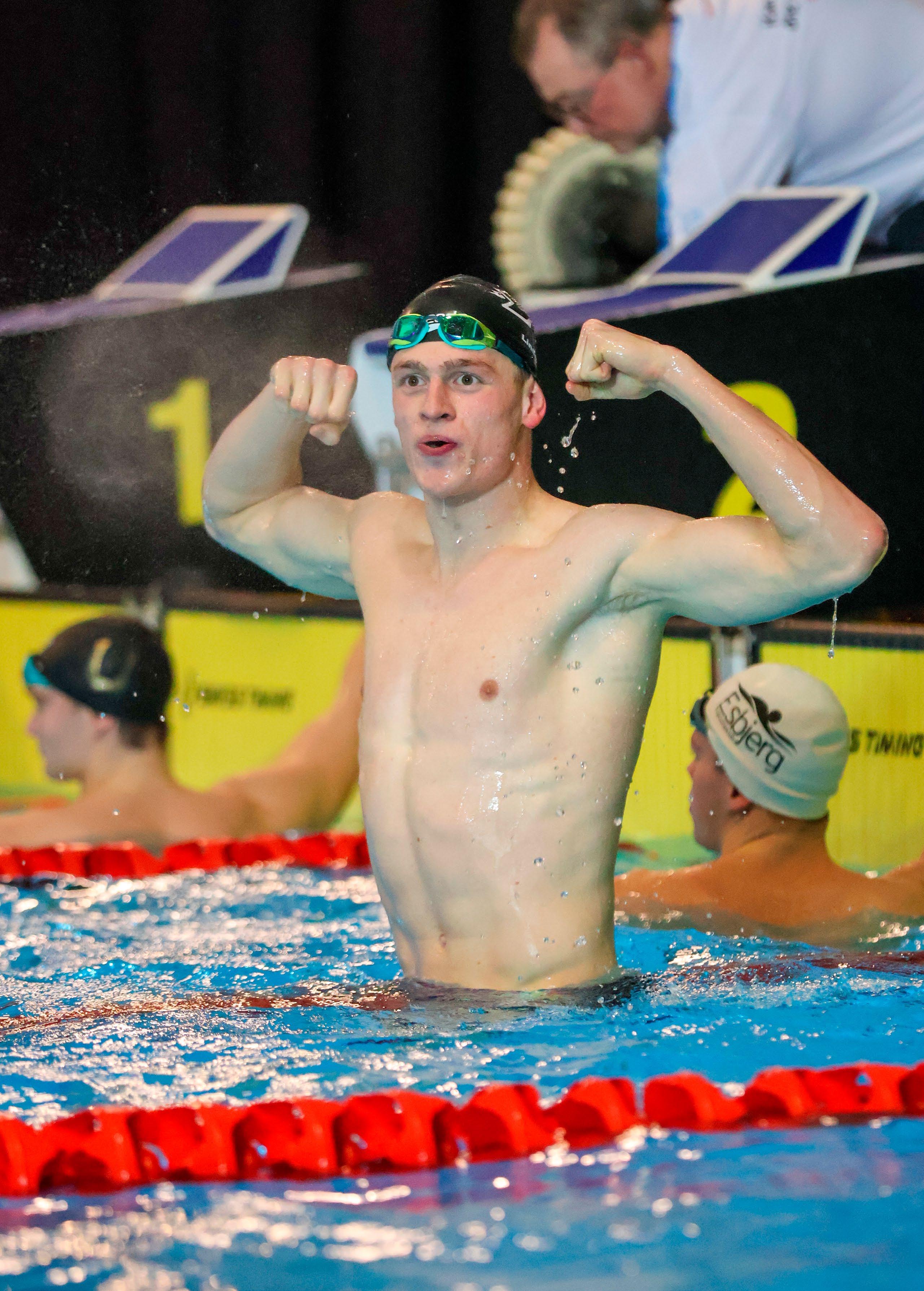 Oliver Niemann Ogstrups reaktion efter at vinde sin første danske juniortitel på hjemmebane i Gladsaxe Svømmehal.