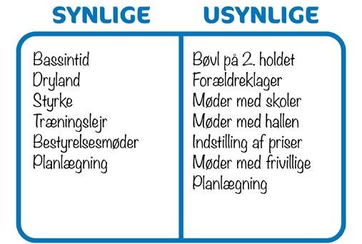 I firkantens højre felt angiver I alle trænerens usynlige opgaver – det som ikke er kendt, aftalt eller en del af jobbeskrivelsen. Fx forældresamarbejde, konflikthåndtering på årgangsholdet, bøvl i trænergruppen og atletsamtaler.