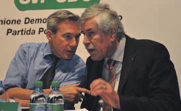 Le président du parti Toni Brunner et le chef de fraction Caspar Baader débattent avec passion.