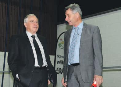 Les conseillers nationaux Christoph Blocher et JeanPierre Grin en pleine conversation. Jean-Pierre Grin a contribué activement à l’organisation de l’AD.
