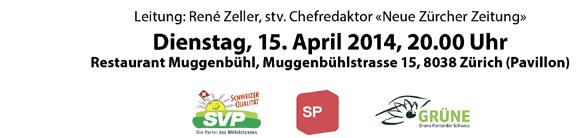 Begrüssung: Nationalrat Jürg Stahl Dienstag, 15. April 2014, 19.30 Uhr Winterthur, MZA Teuchelweiher Fragen & Diskussion, im Anschluss «Kaltes Plättli». Ende der Veranstaltung ca. 21.30 Uhr Wir freuen uns auf viele interessierte Teilnehmer.