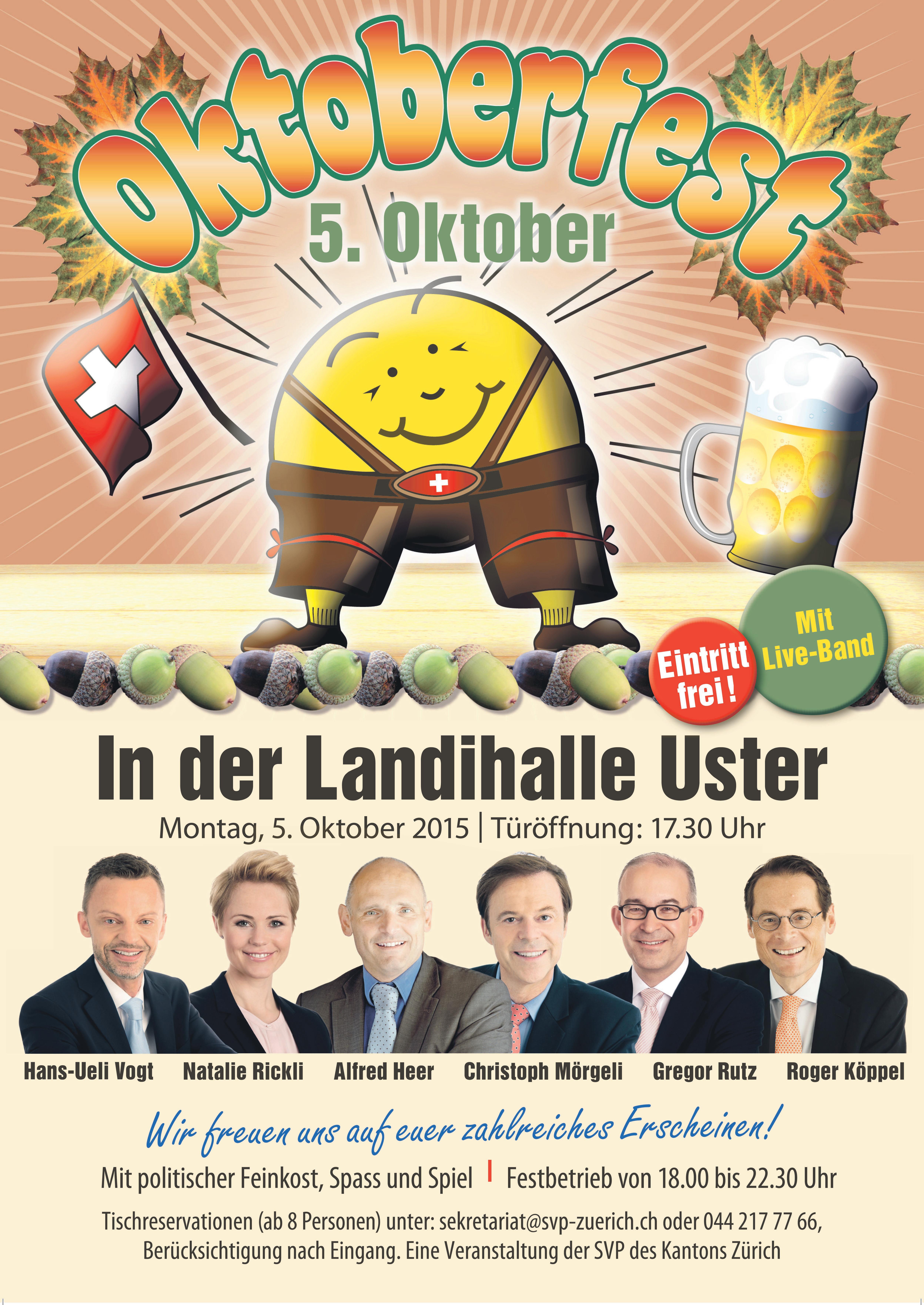 Sonntag, 27. September 2015, 10.00–14.00 Uhr, auf dem Bauernhof von Albert Schumacher im Affoltemer Unterdorf, Zürich, Herbstbrunch. Reichhaltiges Buffet, Folklore Musik, Fahnenschwingen, Alphornbläser. Mit den Nationalräten Alfred Heer und Gregor Rutz und den Nationalratskandidaten Roger Liebi und Mauro Tuena.