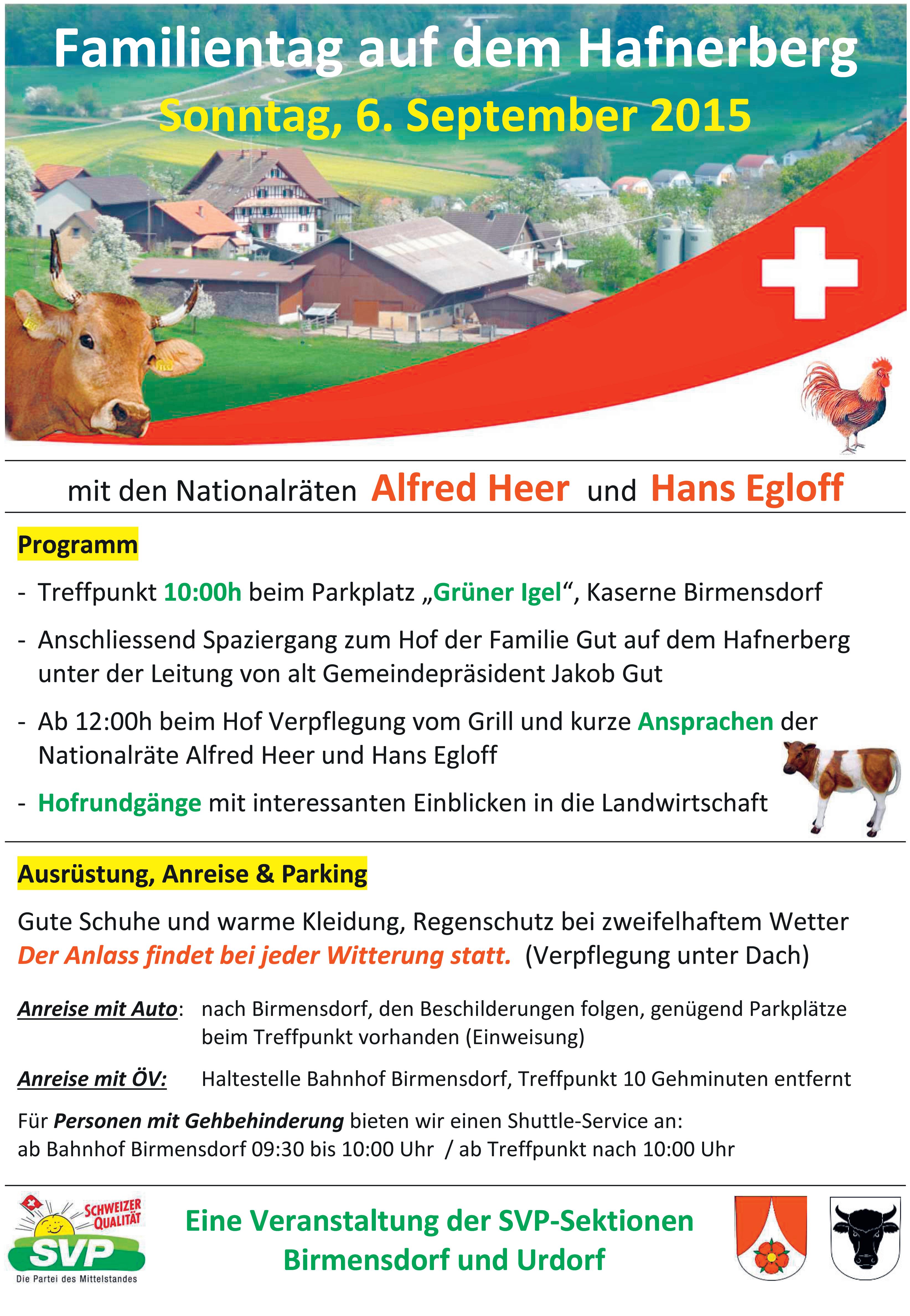 Sonntag, 6. September 2015, Treffpunkt 10.00 Uhr beim Parkplatz «Grüner Igel», Kaserne Birmensdorf, Familientag, Spaziergang zum Hof der Familie Gut auf dem Hafnerberg. Ab 12.00 Uhr Grill und kurze Ansprachen der Nationalräte Alfred Heer und Hans Egloff. Gute Schuhe und warme Kleidung, evt. Regenschutz.
