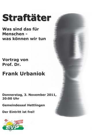Donnerstag, 3. November 2011, 20.00 Uhr, Gemeindesaal Hettlingen, Vortrag von Frank Urbaniok (Gerichtspsychiater) über «Straftäter –was sind das für Menschen, was können wir tun». Eintritt ist frei. Weitere Infos unter www.svp-hettlingen.ch