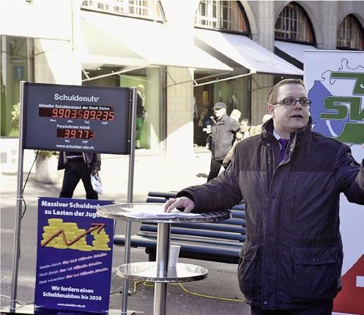 chende Eindämmung der Ausgaben zu bewirken. Der Gemeinderat und Kantonsratskandidat Urech nimmt die rotgrüne Mehrheit in die Verantwortung: «Mit der fi nanziellen Schieflage unserer Stadt gehörte es eigentlich in den Verantwortungsbereich von Stadt- und Gemeinderat, die Ausgaben aufs Wesentliche zu konzentrieren. Sinnvoll sparen heisst, sich zurückzubesinnen, auf das, was zu den essenziellen staatlichen Aufgaben gehört.» Doch die Schulden steigen weiter, denn alleine für dieses Jahr hat die Stadt einen Finanzierungsfehlbetrag von rund 500 Millionen budgetiert. Ein Betrag, den die neu lancierte Schuldenuhr in Echtzeit mitzählt.