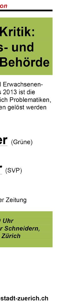 Sozialhilfe-Empfänger, waren es 2013 bereits 45000 – davon fast die Hälfte Ausländer. Die Zürcher Gemeinden fi nanzierten 2013 fast CHF 1,5 Milliarden Sozialausgaben. Traurige Berühmtheit erhielt der Fall einer Eritreer-Familie in der Gemeinde Hagenbuch, die mit Fr. 60000 pro Monat von den Steuerzahlern unterstützt werden musste. Die SVP-Kantonsratsfraktion hat immer wieder auf solche Missstände hingewiesen und mit ihrer konsequenten Politik bewirkt, dass z.B. als Lehre aus dem Fall «Carlos» Frühwarnsysteme bei den Jugendanwaltschaften eingeführt und deren Finanzkompetenzen modernisiert werden, dass die Verbindlichkeit und die Dimensionen der SKOS-Richtlinien hinterfragt und überprüft werden und dass schliesslich die erst seit zwei Jahren tätigen Kindes- und Erwachsenenschutzbehörden (KESB) sich bereits so kurz nach ihrer Installierung kritischen Fragen hinsichtlich Kompetenzen und demokratischer Abstützung stellen müssen.
