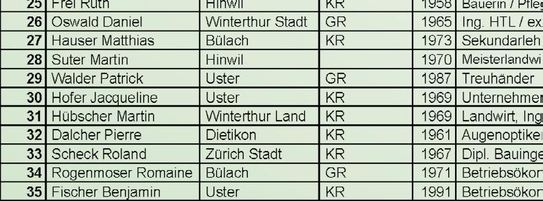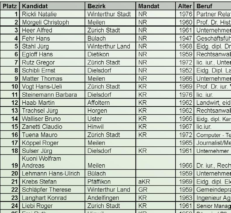 Derzeit stellt die SVP 11 Nationalratssitze, sie will zudem das 35. Mandat gewinnen, das dem Kanton Zürich neu zugeteilt wird. Die Erringung des 12. Nationalratssitzes ist für die SVP sozusagen das Minimalziel. Hans Rutschmann, Präsident der Listengestaltungskommission, erläuterte die gesamte Liste, welche von Kantonalvorstand und Parteileitung zu Handen der Delegiertenversammlung verabschiedet wurde. Die SVP geht mit der Spitzenkandidatin Natalie Rickli ins Rennen. Die populäre Politikerin hatte sich vor vier Jahren auf den ersten Rang gekämpft. Nach Rickli folgen alle Bisherigen in der Reihenfolge ihrer Stimmenzahl. Rang 10 belegt Ständeratskandidat Hans-Ueli Vogt. Rang 11 die jetzige Ersatzkandidatin auf der SVP-Liste, Kantonsrätin Barbara Steinemann.