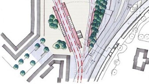 Hier biegt das Tram, von rechts kommend, auf die Rampe ein.