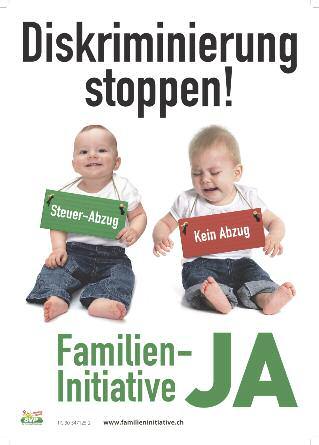 Mit der Familieninitiative – über die das Schweizer Volk am 24. November abstimmen kann – wird Eltern, die ihre Kinder selber betreuen, für die Kinderbetreuung mindestens ein gleich hoher Steuerabzug gewährt werden wie Eltern, die ihre Kinder fremd betreuen lassen Es darf nicht sein, dass Eltern vom Umstand, dass sie ihre Kinder fremd betreuen lassen, steuerlich profitieren können, während Eltern, welche sich der Aufgabe der Kinderbetreuung selber stellen, von diesem Steuervorteil ausgeschlossen bleiben