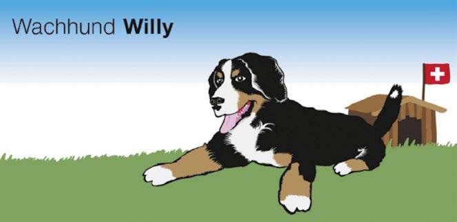 Nachdem Geissbock Zottel, zwar noch quick del, aber doch etwas in die Jahre gekommen ist, gönnen wir ihm den Ruhestand. An seiner Stelle wird der Berner Sennenhund Willy als Wachhund das politische Geschehen wohlwollend, aber wenn nötig auch knurrend oder gar laut bellend kommentieren. Willy (Abkürzung für Wilhelm) ist der Inbegriff für unseren Wahlslogan «Frei bleiben», wie es Wilhelm Tell vorgelebt hat, als er den Gessler-Hut nicht grüsste. Wachhund Willy, der wie jeder Hund freiheitsliebend ist und für Entschlossenheit (Wille) und Sicherheit (Helm) steht, wird das politische Geschehen und Verhalten insbesondere auch der Classe politique für die SVP kommentieren.