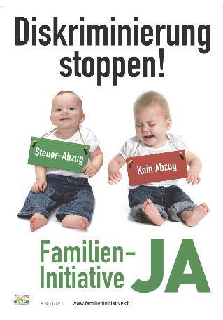 Diskriminierung stoppen Das äusserst wertvolle und grosse persönliche Engagement der Familien geniesst hohen Stellenwert und ist als Fundament unserer Gesellschaft zu würdigen und zu stärken Mit der Familieninitiative soll nun dieser hohe Wert mit einem Steuerabzug für die Eigenbetreuung anerkannt werden Bei der bevorstehenden Abstimmung geht es nicht um unterschiedliche Familienbilder, sondern um die Gleichbehandlung aller Familienmodelle Alle Modelle sind gleich zu unterstützen Bei der Annahme der Familieninitiative können die Kantone weiterhin selbst entscheiden, wie hoch der Steuerabzug sein soll Daher sind alle kursierenden Beträge rein hypothetisch Wir leben in einer modernen Welt, wo jede Familie Verantwortung wahrzunehmen und selbst zu entscheiden hat ob die Kinder extern oder in der eigenen Familie erzogen werden Wenn Gegner der Familieninitiative bei der Eigenbetreuung despektierlich von Herdprämie sprechen, erwecken sie den Eindruck, dass man der Wertschätzung der traditionellen Familie viel zu wenig Achtung schenkt Es soll Gerechtigkeit hergestellt werden, denn eine grosse Mehrheit der Familien organisiert die Betreuung selbst und beansprucht keinen staatlich finanzierten Krippenplatz Zum heutigen Zeitpunkt kommen Betreuungsabzüge und damit Steuererleichterungen nur jenen Familien zugute die ihre Kinder fremd betreuen lassen Mit diesem Vorgehen diskriminiert das Parlament Hunderttausende Familien in der Schweiz, bei denen die Betreuung und die Erziehung der Kinder durch die Eltern selber wahrgenommen werden