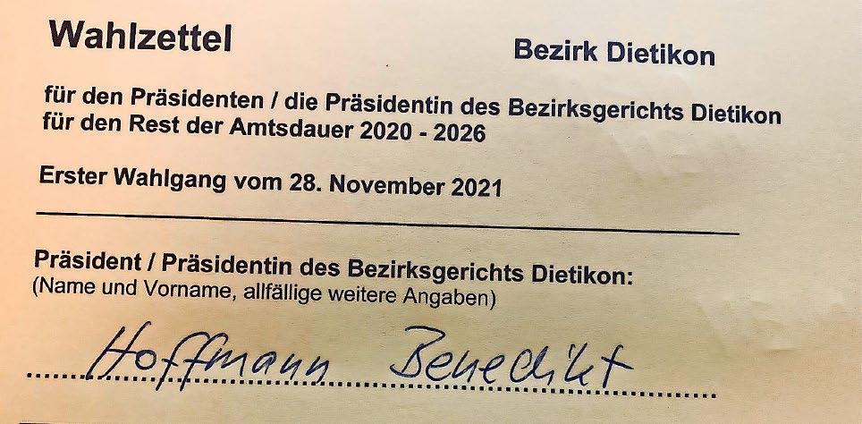 Der Präsident erinnerte nochmals, dass Benedikt Hoffmann als Präsident des Bezirksgerichts auf den Wahlzettel geschrieben und bei Freunden, Familie und Bekannten Werbung für ihn gemacht werden soll.