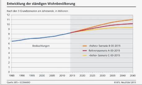 te das Wachstum in Deutschland bloss zu 4%. Für die Zukunft haben die Statistiker beim Bund drei Szenarien erarbeitet: Läuft die Wirtschaft in der EU in den kommenden Jahren nicht immer rosig, so werden mehr Europäer ihr Erwerbsglück in der Schweiz versuchen: Die 10 Mio. Schweiz würde in diesem Falle bereits 2030, also in 10 Jahren, Realität. 11 Mio. Einwohner sind dann für 2045 prophezeit. Mangels eines Steuerungsmechanismus ist die Bevölkerungsentwicklung der Schweiz fast ausschliesslich von den EU -Staaten und deren Wirtschaftslage abhängig: Die deutsche Automobilbranche, die französischen Gewerkschaften oder die Schulden der Griechen bestimmen, wie sich diesbezüglich unser Land entwickelt.