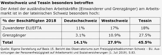 zessiven Einwanderung zeigen die statistischen Daten auf: Waren 2018 bei den RAV rund 93 000 Stellensuchende für Branchen mit 5% und höherer Arbeitslosigkeit gemeldet und im Jahr 2019 81 000 Stellensuchende registriert, so wanderten 2018 volle 43 000 neue EU -Zuwanderer und 2019 volle 37 000 EU -Bürger neu in Stellen mit dieser hohen Arbeitslosenquote ein. Bekanntlich hat die Schweizer Stimmbevölkerung am 9. Februar 2014 die Volksinitiative der SVP gegen die Masseneinwanderung angenommen. Diese neue Verfassungsbestimmung hat das Parlament bekanntlich nicht umgesetzt, sondern mit einem sog. «Inländervorrang light» versehen: Arbeitgeber von Branchen mit 5 Prozent und höherer Arbeitslosigkeit sehen sich seither gezwungen, die offenen Stellen fünf Tage lang nicht öffentlich auszuschreiben, sondern den RAV zu melden und damit den bei den RAV registrierten Stellensuchenden einen fünftägigen Wissensvorsprung vom freien Arbeitsplatz zu ermöglichen.