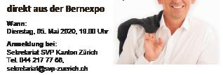 Moderator: Kantonsrat Hans-Peter Amrein Co-Leiter: Kantonsrat Matthias Hauser. Anmeldung an sekretariat@svp-zuerich.ch oder 044 217 77 66