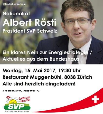 Montag, 15. Mai 2017, 19 00 –19 30 Uhr, Restaurant Muggenbühl, Muggenbühlstrasse 15, Zürich, Generalversammlung. Anschliessend (auch für Gäste) Referat von Nationalrat Albert Rösti, Präsident SVP Schweiz.