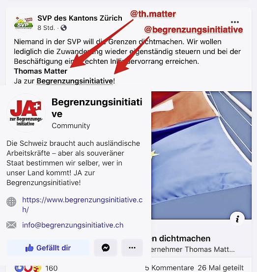 Beispiel von Facebook, in dem Nationalrat Thomas Matter und die Begrenzungsinitiative erwähnt wurden. Quelle: openbyte.ch