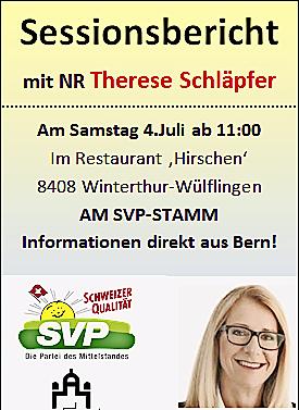 Samstag, 4 Juli 2020, 11:00 Uhr, Sessionsbericht, Restaurant Hirschen, WinterthurWülflingen, mit Nationalrätin Therese Schläpfer.