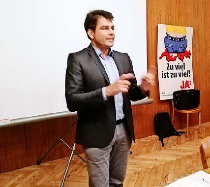 BGI -Kampagnenleiter Michael Trachsel veranschaulicht die masslose-Zuwanderung anhand eines Modells.