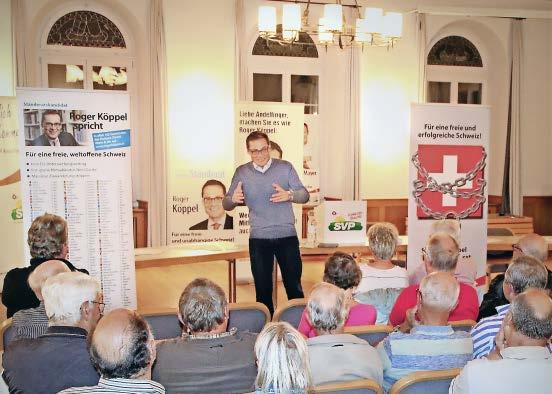 RoMü. Der SVP-Ständeratskandidat Roger Köppel hat sich viel vorgenommen. Er will alle 162 Zürcher Gemeinden besuchen und hatte am vergange nen Abend vor einem beachtlichen Pu blikum in Kleinandelfingen seinen 127. Auftritt. «Sie sind damit auf dem Wahl marathon bei Kilometer 33 angelangt», hielt SVP-Sektionspräsident Mike Hotz fest.