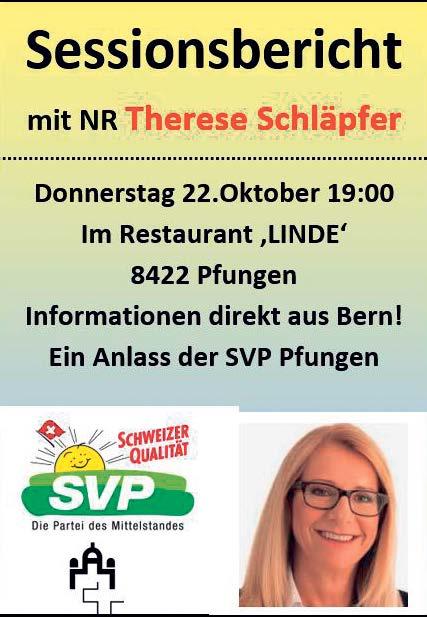 Donnerstag, 22 Oktober 2020 19 00 Uhr, Sessionsbericht, Restaurant Linde, Pfungen, mit Nationalrätin Therese Schläpfer.