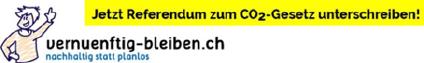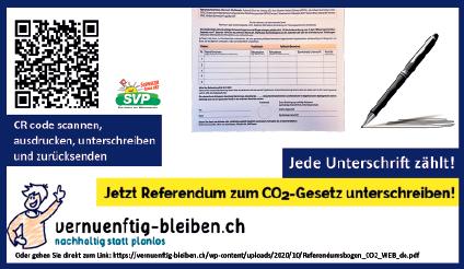 svp. Das neue CO2Gesetz kostet viel und bringt nichts. Es führt zu mehr Bürokratie, mehr Verboten, mehr Vorschriften und neuen Steuern und Abgaben. Dabei ist die Schweiz auch ohne CO2Gesetz klimapolitisch vorbildlich unterwegs. Aus diesem Grund ergreift ein breit aufgestelltes Wirtschaftskomitee, dem Verbände aus verschiedensten Branchen angehören, das Referendum. Weitere Informationen erhalten Sie auf www.vernuenftigbleiben.ch.