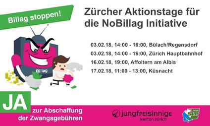Samstag, 3 Februar 2018, 14 00 –16 00 Uhr, Bülach/Regensdorf, Zürcher Aktionstage für die No Billag Initiative.