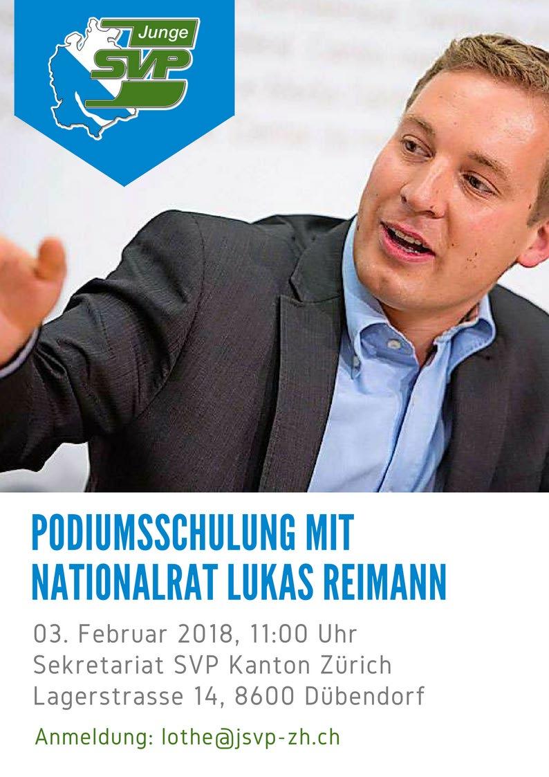 Samstag, 3 Februar 2018, 11 00 Uhr, Sekretariat SVP Kanton Zürich, Lagerstrasse 14, Dübendorf, Podiumsschulung mit Nationalrat Lukas Reimann. Anmeldung an lothe@jsvp zh.ch.