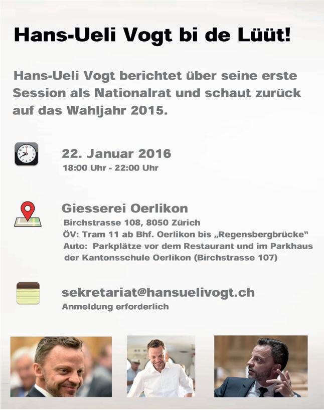 Freitag, 22. Januar 2016, 18 00 –22 00 Uhr, Giesserei Oerlikon, Birchstrasse 108, Zürich, Hans Ueli Vogt bi de Lüüt! Bericht über die Session und Rückblick auf das Wahljahr 2015. Anmeldung erforderlich: sekretariat@ hansuelivogt.ch