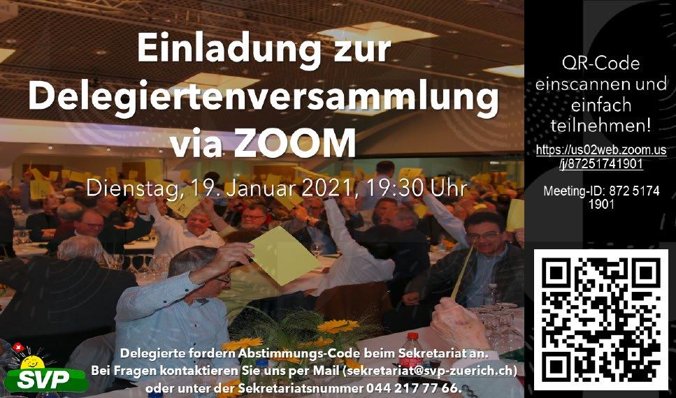 Die Delegierten werden aufgefordert, die Delegiertenversammlung am Dienstag, 19. Januar 2021 19 30 Uhr, zu besuchen. Die Versammlung findet über Zoom statt. Die Einladung mit Zugangslink erhalten Sie in den nächsten Tagen zugestellt.