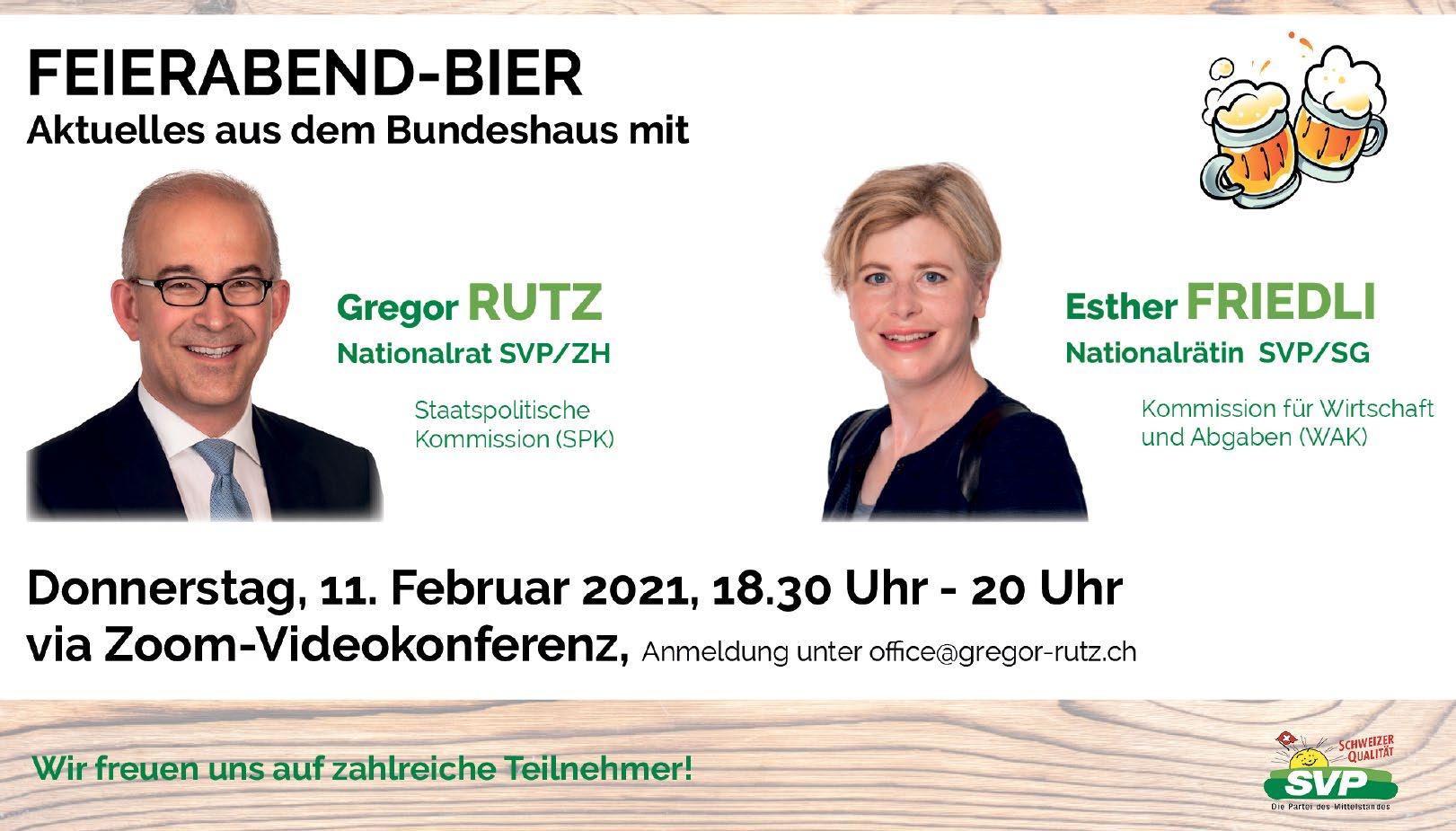 Donnerstag, 11 Februar 2021 18 30 –20 00 Uhr, Feierabend-Bier via Zoom-Videokonferenz, mit den Nationalräten Esther Friedli und Gregor Rutz. Anmeldung unter office@ gregor-rutz.ch.