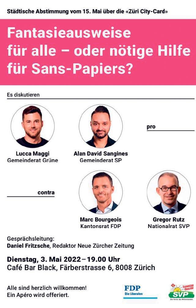 Dienstag, 3 Mai 2022, 19 00 Uhr, Podium zur «Züri City Card», Café Bar Black, Färberstrasse 6, Zürich, u.a. mit Nationalrat Gregor Rutz. Ein Apéro wird offeriert.